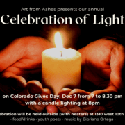 AfA’s annual Celebration of Light on Tuesday the 7th at 7pm, brings together the beautiful humans in our community to observe the triumphs and accomplishments of the year. Light is the common bond that unites diverse holiday celebrations at the end of the year. It signifies hope, rebirth, and guidance—that are honored when we come together to applaud the youth we serve and the community it takes to serve them. We ask everyone to shine a light on the Art from Ashes youth with their unwavering support and kindness at this special time of the year! REGISTER HERE or just show up!